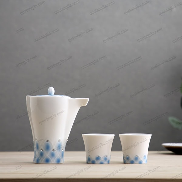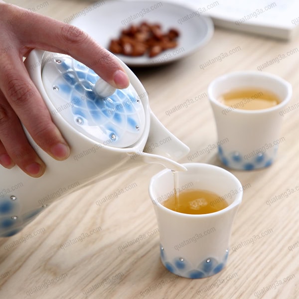 Bộ bình và cốc uống trà 3 món với nét thanh lịch, tao nhã với chất men sứ trắng lạnh, màu xanh lam nhạt thuần khiết của của từng lớp cánh hoa và điểm thêm vẻ đẹp long lanh của đá kim cương nhân tạo Swarovski. Set đựng trà sẽ tạo cho người sử dụng những trải nghiệm thú vị, thêm phần tận hưởng thú vui trà đạo yêu thích của mình.