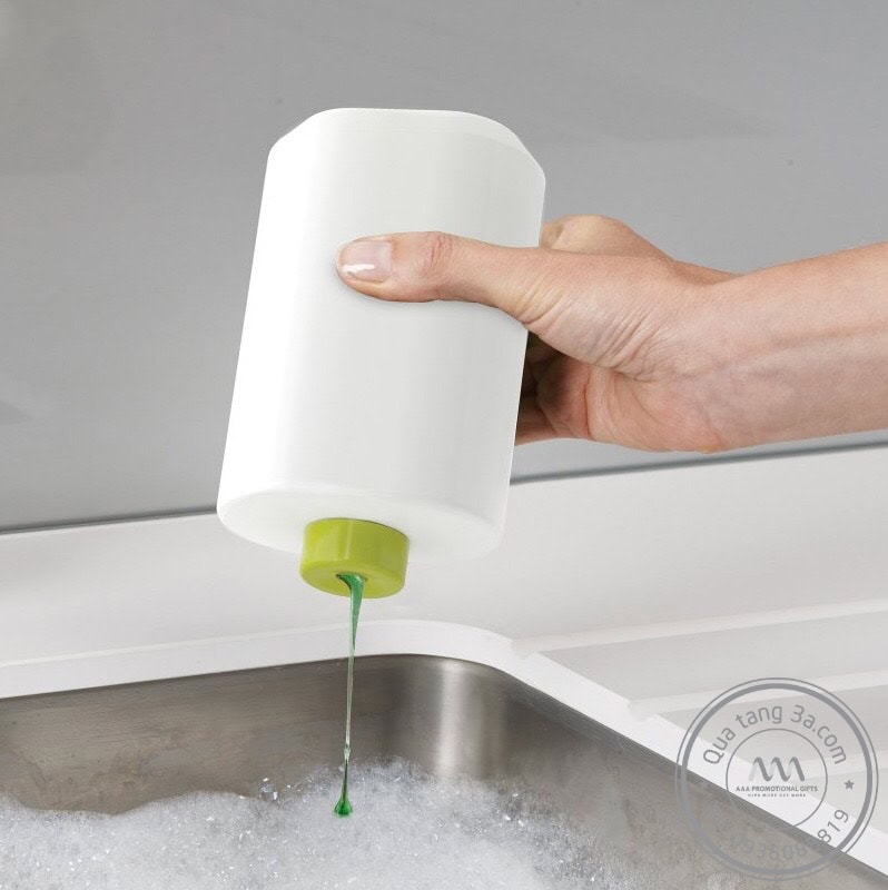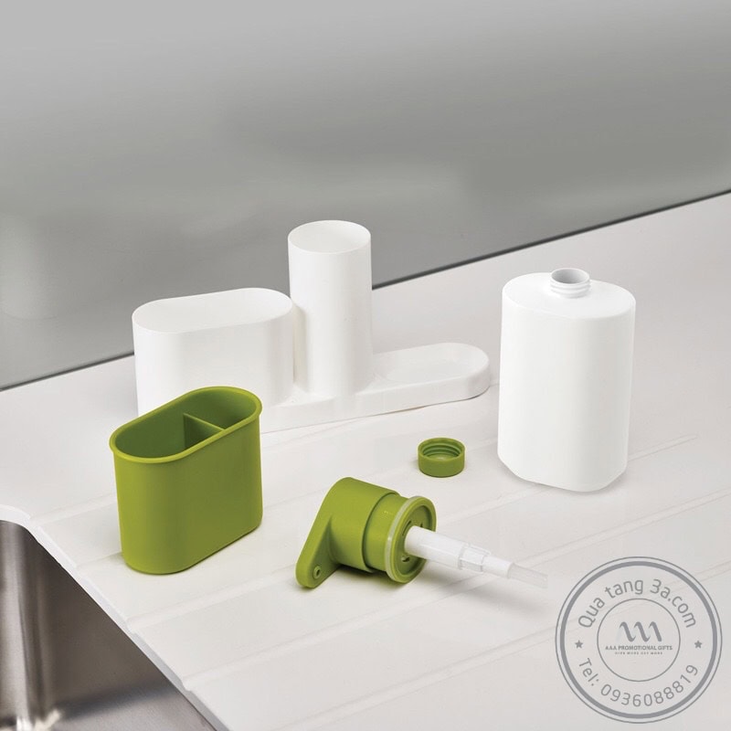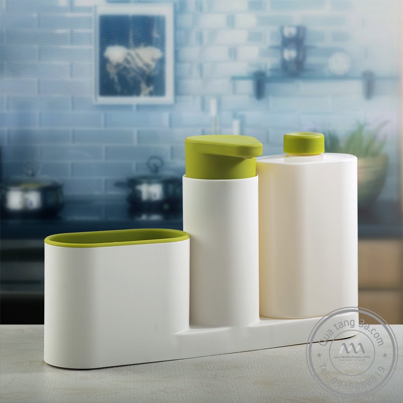 Ngăn ở giữa của bộ dụng cụ rửa ba món có công dụng đựng nước rửa tay được thiết kế dạng nhấn giúp giảm thiểu tối đa diện tích tiếp xúc giúp cho bạn rửa tay một cách dễ dàng. Phần nắp hộp dạng xoay giúp bạn thay thế và đổ đầy xà phòng nhanh chóng. Bên trái là ngăn đựng các loại dụng cụ chà rửa như: bọt biển, bàn chải cọ rửa nhà bếp,… với độ cao phù hợp. Cuối cùng là ngăn đựng nước rửa chén có thiết kế tương tự như các loại nước rửa chén phổ biến trên thị trường.