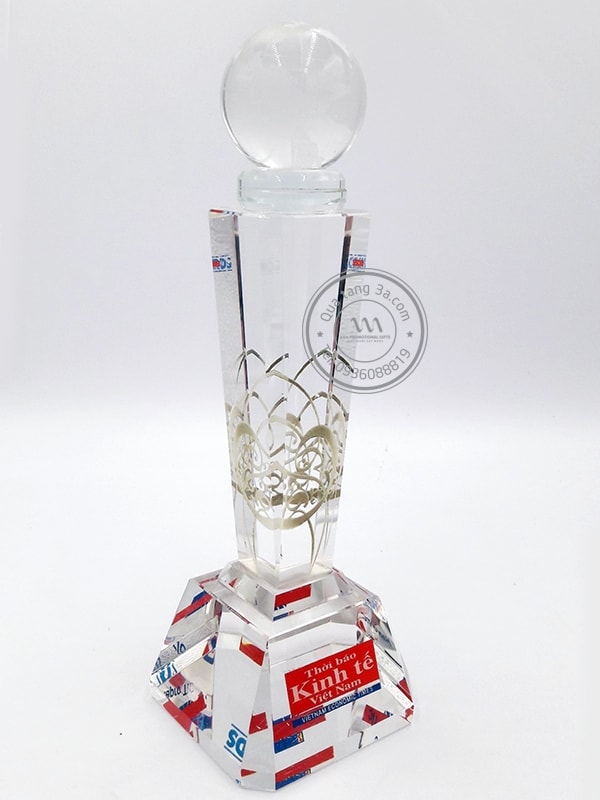 - Thân cúp là khối pha lê trong suốt hình lăng trụ với những cạnh được cắt chuẩn sắc nét, hiệu ứng tương phản ánh sáng.