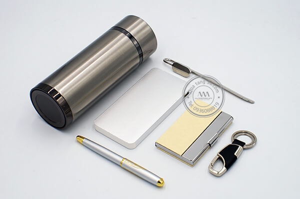Bộ Gift set 6 món Bình giữ nhiệt inox – Chặn sách kim loại – hộp namecard – móc khóa da – pin sạc dự phòng – bút ký kim loại