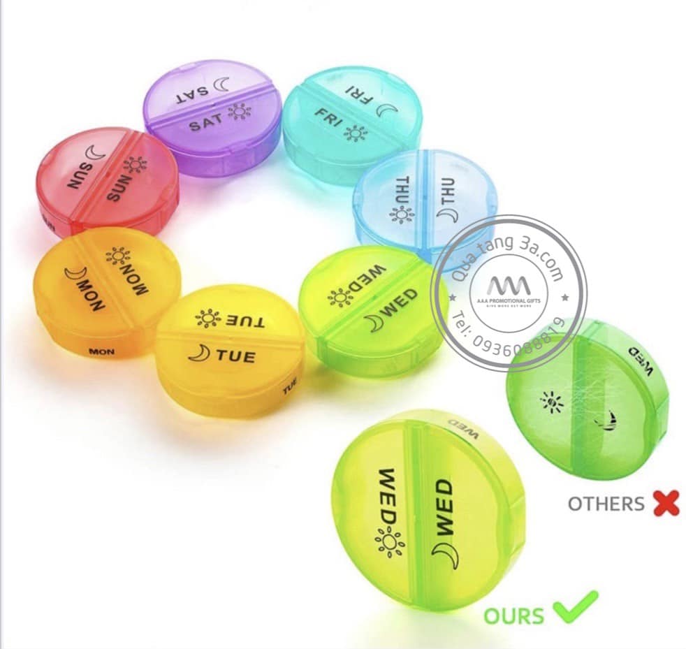 Hộp chia thuốc in logo là món đồ bảo vệ sức khỏe không thể thiếu với bạn và những người thân yêu, thiết kế tiện dụng dễ dàng phân loại và bảo quản thuốc cần uống cho từng ngày trong tuần, kích thước nhỏ gọn, dễ mang theo mọi lúc mọi nơi. Đây chắc chắn là món đồ du lịch tiện ích có thể hỗ trợ bạn trong những chuyến đi xa.