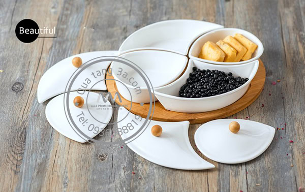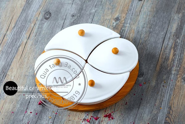 Khay gỗ có 4 hộp sứ riêng biệt và có nắp đậy giúp bảo quản thực phẩm được lâu hơn.