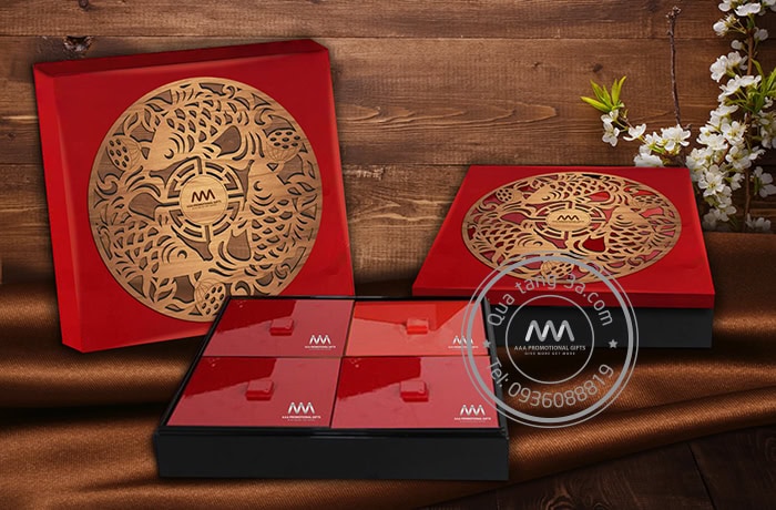– 1 hộp to bên ngoài bằng sơn mài chứa 4 hộp nhỏ bên trong, hoa văn tinh xảo, có in logo doanh nghiệp.