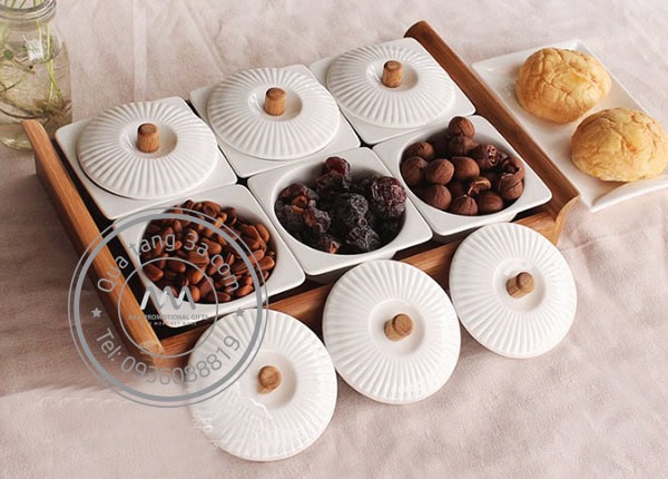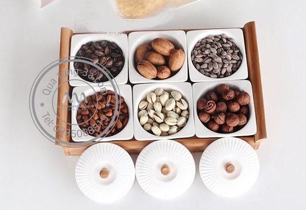 Khay gỗ gồm 6 âu sứ riêng biệt có nắp.