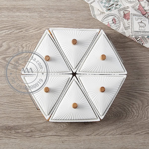 – Khay gỗ có 6 hộp sứ riêng biệt và có nắp đậy kín giúp bảo quản thực phẩm được lâu hơn.
