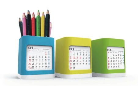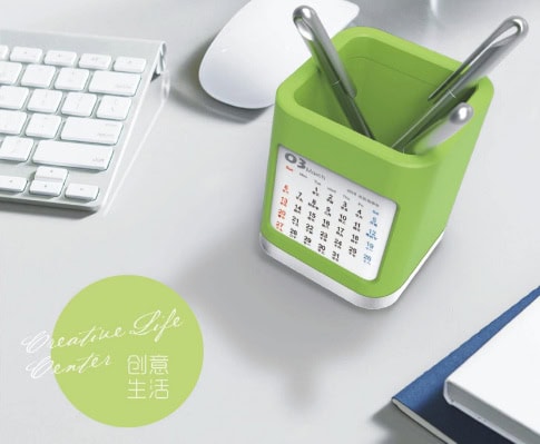 Sản phẩm lịch này được làm từ chất liệu nhựa ABS, với nhiều màu sắc ấn tượng, thiết kế đơn giản, dễ dàng tháo lắp và trở thành một ống cắm bút tiện ích trên mặt bàn làm việc.